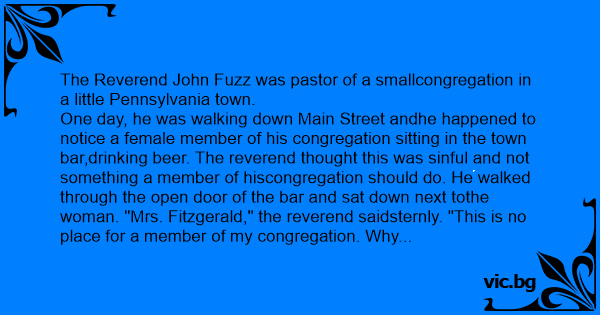 One day, he was walking down Main Street andhe happened to notice a female member of his congregation sitting in the town bar,drinking вееr. The reverend thought this was sinful and not something a member of hiscongregation should do. He walked through the open door of the bar and sat down next tothe woman. "Mrs. Fitzgerald," the reverend saidsternly. "This is no place for a member of my congregation. Why don't you let me takeyou home?" "Sure," she said with a slur, obviouslyvery drunк. When Mrs. Fitzgerald stood up from the bar, she began to