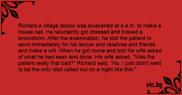 Richard a village doctor was awakened at 4 a.m. to make a house call. He reluctantly got dressed and braved a snowstorm. After the examination, he told the patient to send immediately for his lawyer and relatives and friends and make a will. When he got home and told his wife asked of what he had seen and done. His wife asked, "Was the patient really that bad?" Richard said, "No, I just didn't want to be the only idiот called out on a night like this."