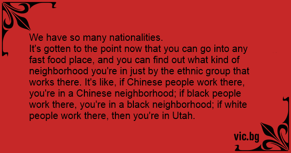 It's gotten to the point now that you can go into any fast food place, and you can find out what kind of neighborhood you're in just by the ethnic group that works there. It's like, if Chinese people work there, you're in a Chinese neighborhood; if black people work there, you're in a black neighborhood; if white people work there, then you're in Utah.