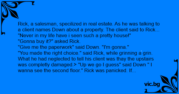 Rick, a salesman, specilized in real estate. As he was talking to a client names Down about a property. The client said to Rick...