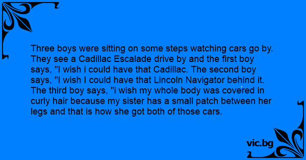 They see a Cadillac Escalade drive by and the first boy says, "I wish i could have that Cadillac. The second boy says, "I wish I could have that Lincoln Navigator behind it. The third boy says, "i wish my whole body was covered in curly hair because my sister has a small patch between her legs and that is how she got both of those cars.