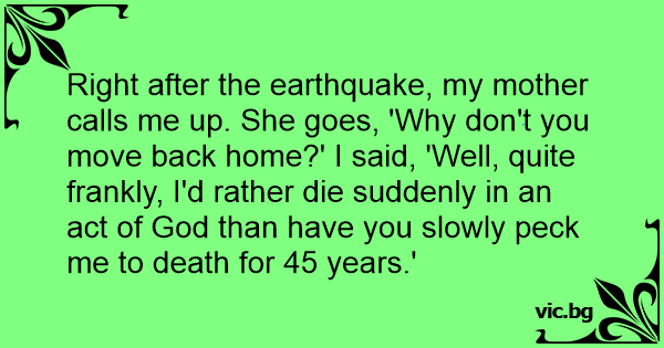Right after the earthquake, my mother calls me up. She goes, 'Why don't you move back home?' I said, 'Well, quite frankly, I'd rather die suddenly in an act of God than have you slowly peck me to death for 45 years.'