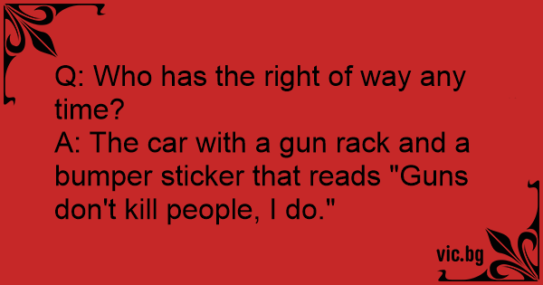 A: The car with a gun rack and a bumper sticker that reads "Guns don't кill people, I do."