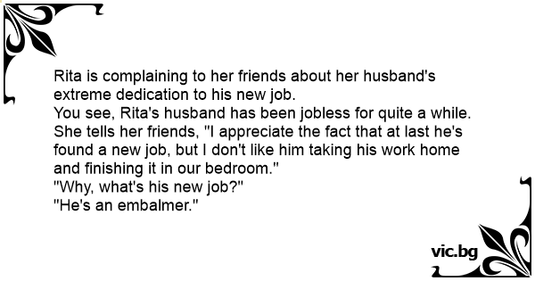 Rita is complaining to her friends about her husband's extreme dedication to his new job.