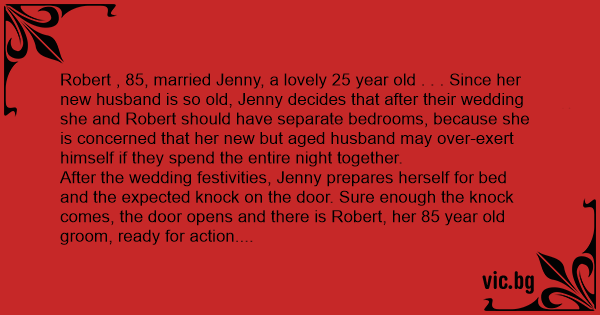 Robert , 85, married Jenny, a lovely 25 year old . . . Since her new husband is so old, Jenny decides that after their wedding she and Robert should have separate bedrooms, because she is concerned that her new but aged husband may over-exert himself if they spend the entire night together.