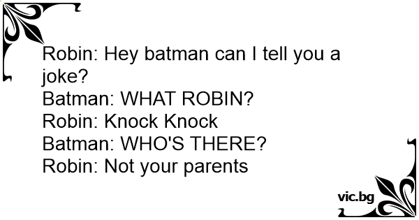 Robin: Hey batman can I tell you a joke?<br />Batman: WHAT ROBIN?<br />Robin: Knock Knock <br />Batman: WHO'S THERE?<br />Robin: Not your parents