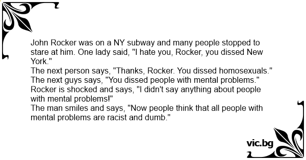 John Rocker was on a NY subway and many people stopped to stare at him. One lady said, "I hate you, Rocker, you dissed New York."