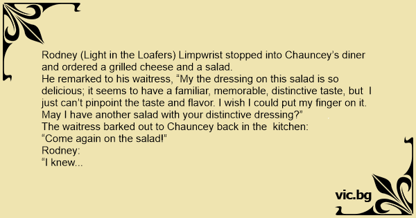 Rodney (Light in the Loafers) Limpwrist stopped into Chauncey’s diner and ordered a grilled cheese and a salad.