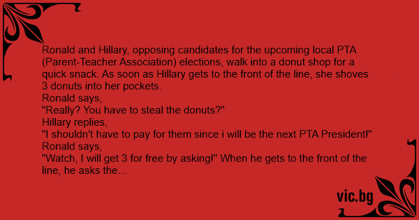 Ronald and Hillary, opposing candidates for the upcoming local PTA (Parent-Teacher Association) elections, walk into a donut shop for a quick snack. As soon as Hillary gets to the front of the line, she shoves 3 donuts into her pockets.