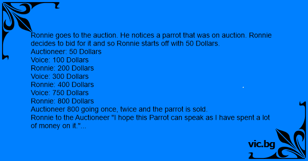 Ronnie goes to the auction. He notices a parrot that was on auction. Ronnie decides to bid for it and so Ronnie starts off with 50 Dollars.