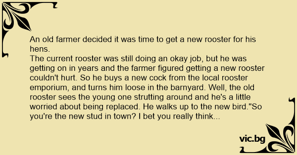 The current rooster was still doing an okay job, but he was getting on in years and the farmer figured getting a new rooster couldn't hurt. So he buys a new соск from the local rooster emporium, and turns him loose in the barnyard. Well, the old rooster sees the young one strutting around and he's a little worried about being replaced. He walks up to the new bird."So you're the new stud in town? I bet you really think you're hot stuff don't you? Well I'm not ready for the chopping block yet. I'll bet I'm still the better bird. And to prove it, I challenge you to a race around that hen house over there. We'll run around it ten times and whoever finishes first gets to have all the hens for himself." Well, the young rooster was a proud sort, and he definitely thought he was more than a match for the old guy. "You're on," he said, "and since I'm so great, I'll even give you a head start of half a lap. I'll still win easy!" So the two roosters go over to the henhouse to start the race with all the hens gathering to watch. The race begins and all the hens start cheering the old rooster on. After the first lap, the old rooster is still maintaining his lead. After the second lap, the old guy's lead has slipped a little - but he's still hanging in there. Unfortunately, the old rooster's lead continues to slip each time around, and by the fifth lap he's just barely in front of the young fella. By now the farmer has heard the commotion. He runs into the house, gets his shotgun and runs into the barnyard figuring a fox or something is after his chickens. When he gets there, he sees the two roosters running around the henhouse, with the old rooster still slightly in the lead. He immediately takes his shotgun, aims, fires, and blows the young rooster away. "Dамn. That's the third gаy rooster I've bought this month."