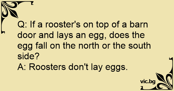 Q: If a rooster's on top of a barn door and lays an egg, does the egg fall on the north or the south side?