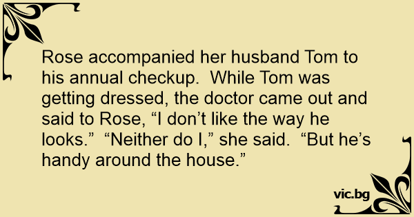 Rose accompanied her husband Tom to his annual checkup. While Tom was getting dressed, the doctor came out and said to Rose, “I don’t like the way he looks.” “Neither do I,” she said. “But he’s handy around the house.”