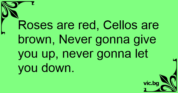 Roses are red, Cellos are brown, Never gonna give you up, never gonna let you down.