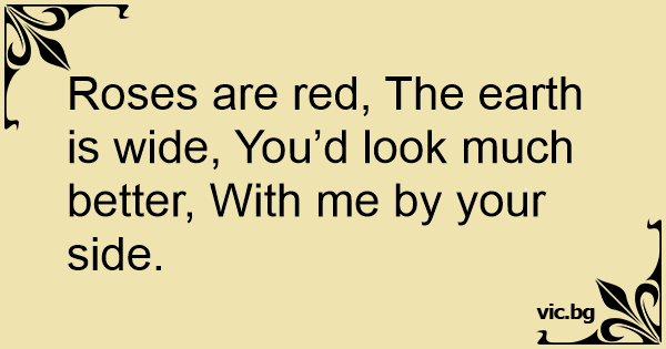 Roses are red, The earth is wide, You’d look much better, With me by your side.