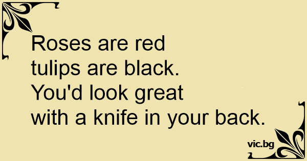 Roses are red<br />tulips are black.<br />You'd look great<br />with a knife in your back.