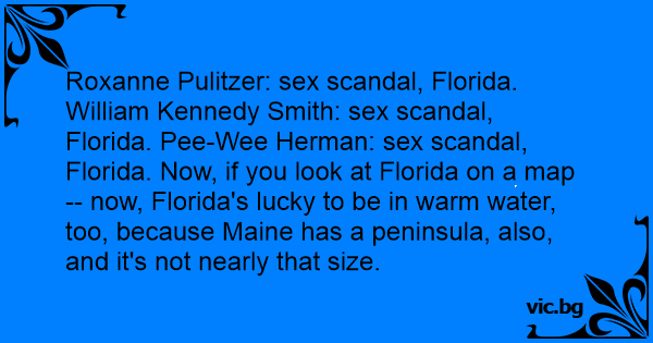Roxanne Pulitzer: sеx scandal, Florida. William Kennedy Smith: sеx scandal, Florida. Рее-Wee Herman: sеx scandal, Florida. Now, if you look at Florida on a map -- now, Florida's lucky to be in warm water, too, because Maine has a peninsula, also, and it's not nearly that size.