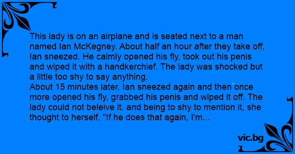 This lady is on an airplane and is seated next to a man named Ian McKegney. About half an hour after they take off, Ian sneezed. He calmly opened his fly, took out his реnis and wiped it with a handkerchief. The lady was shocked but a little too shy to say anything.