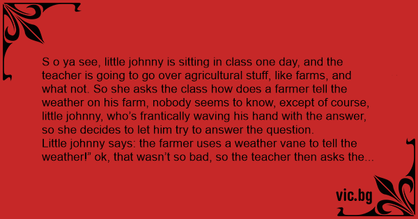 S o ya see, little johnny is sitting in class one day, and the teacher is going to go over agricultural stuff, like farms, and what not. So she asks the class how does a farmer tell the weather on his farm, nobody seems to know, except of course, little johnny, who’s frantically waving his hand with the answer, so she decides to let him try to answer the question.