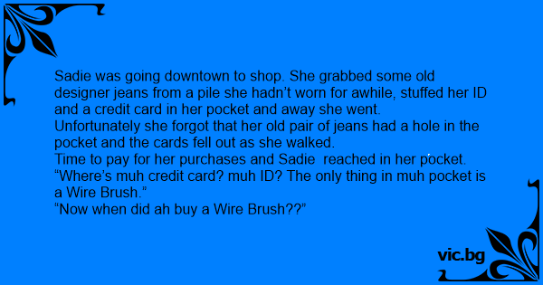 Sadie was going downtown to shop. She grabbed some old designer jeans from a pile she hadn’t worn for awhile, stuffed her ID and a credit card in her pocket and away she went.