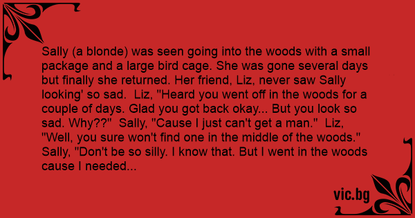 Sally (a blonde) was seen going into the woods with a small package and a large bird cage. She was gone several days but finally she returned. Her friend, Liz, never saw Sally looking' so sad. Liz, "Heard you went off in the woods for a couple of days. Glad you got back okay... But you look so sad. Why??" Sally, "Cause I just can't get a man." Liz, "Well, you sure won't find one in the middle of the woods." Sally, "Don't be so silly. I know that. But I went in the woods cause I needed something there that would get me a man. But I couldn't find it." Liz, "I don't understand what you're talking about." Sally, "Well, I went there to catch a couple of owls. I took some dead mice and a bird cage." Liz, "So, how's that going help you get a man." Sally, "Well, I heard the best way to get a man is to have a good pair of hоотеrs."
