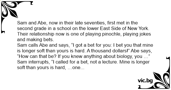 Sam calls Abe and says, “I got a bet for you: I bet you that mine is longer soft than yours is hard. A thousand dollars!” Abe says, “How can that be? If you knew anything about biology, you …”
