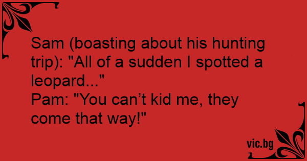 Sam (boasting about his hunting trip): "All of a sudden I spotted a leopard..."