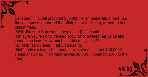 Sam died. His Will provided $30,000 for an elaborate funeral. As the last guests departed the affair, his wife, Helen, turned to her oldest friend.