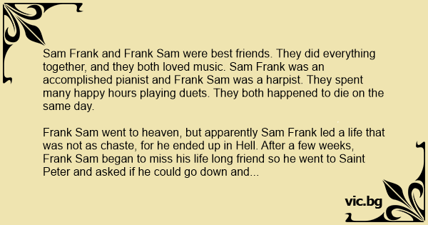 Sam Frank and Frank Sam were best friends. They did everything together, and they both loved music. Sam Frank was an accomplished pianist and Frank Sam was a harpist. They spent many happy hours playing duets. They both happened to die on the same day.