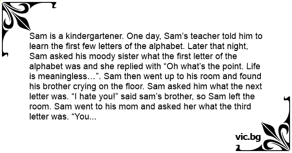 Sam is a kindergartener. One day, Sam’s teacher told him to learn the first few letters of the alphabet. Later that night, Sam asked his moody sister what the first letter of the alphabet was and she replied with “Oh what’s the point. Life is meaningless…”. Sam then went up to his room and found his brother crying on the floor. Sam asked him what the next letter was. “I hate you!” said sam’s brother, so Sam left the room. Sam went to his mom and asked her what the third letter was. “You sтuрid f*****” his mom yelled at him. So Sam went to ask his Grandpa what the fourth letter is and his grandpa didn’t reply, so Sam went to bed.