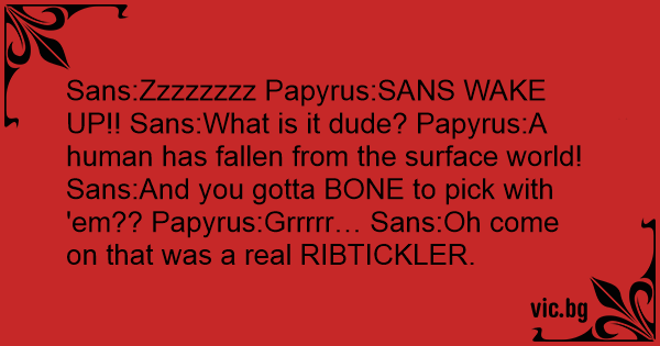 Sans:Zzzzzzzz Papyrus:SANS WAKE UP!! Sans:What is it dude? Papyrus:A human has fallen from the surface world! Sans:And you gotta ВОNЕ to pick with 'em?? Papyrus:Grrrrr… Sans:Oh come on that was a real RIBTICKLER.