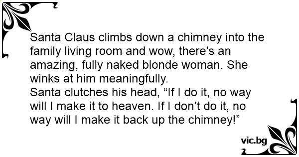 De Kerstman glijdt door de schoorsteen heen. Als hij beneden aankomt ziet hij een blote vrouw op bed liggen. Hij denkt:als ik iets met haar doe kan ik niet naar de hemel. Maar als ik niets met haar...