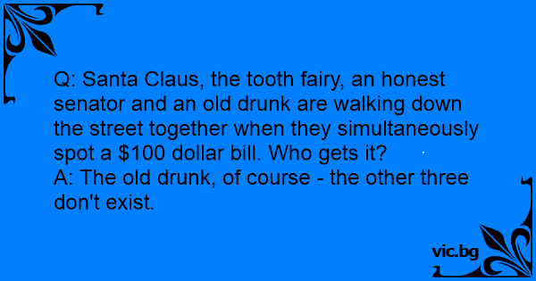 Q: Santa Claus, the tooth fairy, an honest senator and an old drunк are walking down the street together when they simultaneously spot a $100 dollar bill. Who gets it?