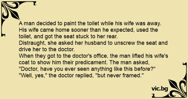 A man decided to paint the toilet while his wife was away. His wife came home sooner than he expected, used the toilet, and got the seat stuck to her rear.