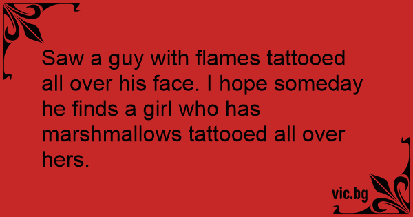 Saw a guy with flames tattooed all over his face. I hope someday he finds a girl who has marshmallows tattooed all over hers.