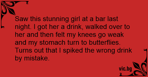Saw this stunning girl at a bar last night. I got her a drink, walked over to her and then felt my knees go weak and my stomach turn to butterflies. Turns out that I spiked the wrong drink by mistake.
