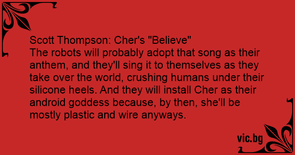 The robots will probably adopt that song as their anthem, and they'll sing it to themselves as they take over the world, crushing humans under their silicone heels. And they will install Cher as their android goddess because, by then, she'll be mostly plastic and wire anyways.