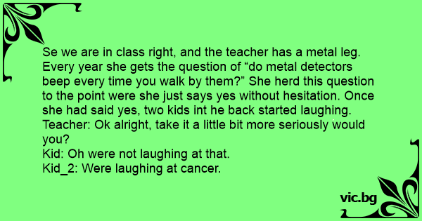 Se we are in class right, and the teacher has a metal leg. Every year she gets the question of “do metal detectors beep every time you walk by them?” She herd this question to the point were she just says yes without hesitation. Once she had said yes, two kids int he back started laughing.