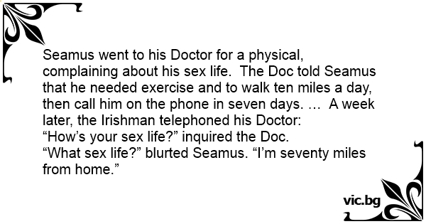 Seamus went to his Doctor for a physical, complaining about his sеx life. The Doc told Seamus that he needed exercise and to walk ten miles a day, then call him on the phone in seven days. … A week later, the Irishman telephoned his Doctor: