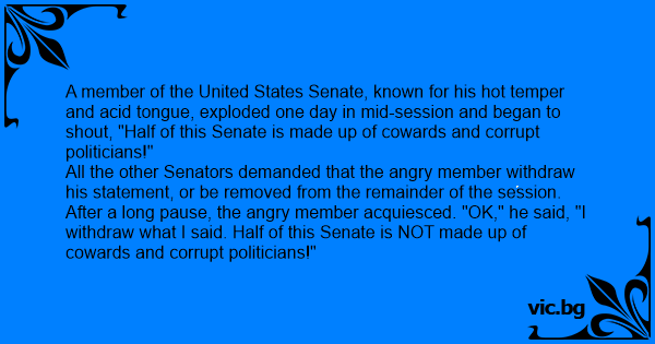 After a long pause, the angry member acquiesced. "OK," he said, "I withdraw what I said. Half of this Senate is NOT made up of cowards and corrupt politicians!"