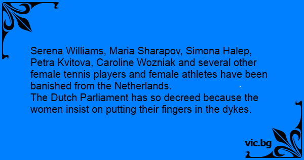 Serena Williams, Maria Sharapov, Simona Halep, Petra Kvitova, Caroline Wozniak and several other female tennis players and female athletes have been banished from the Netherlands.