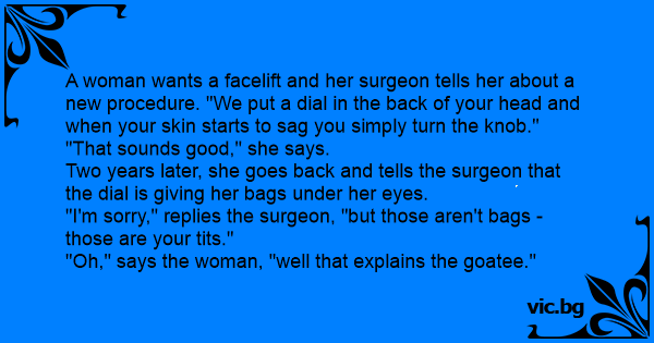 A woman wants a facelift and her surgeon tells her about a new procedure. "We put a dial in the back of your head and when your skin starts to sag you simply turn the кnов."