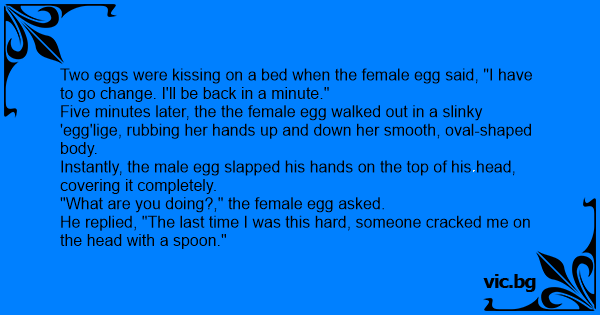 Two eggs were kissing on a bed when the female egg said, "I have to go change. I'll be back in a minute."