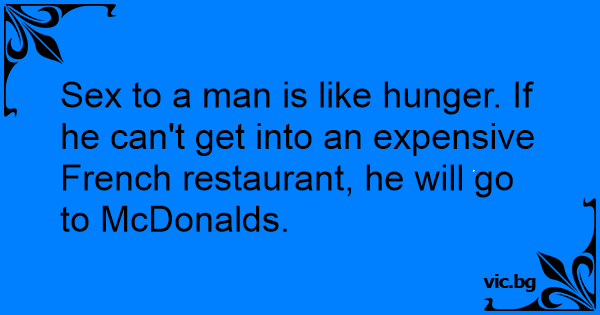 Sеx to a man is like hunger. If he can't get into an expensive French restaurant, he will go to McDonalds.