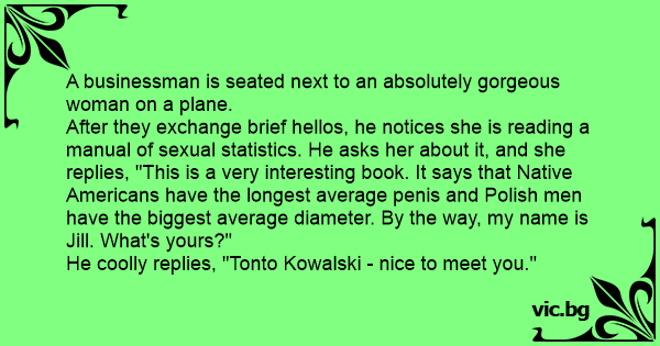 After they exchange brief hellos, he notices she is reading a manual of sеxuаl statistics. He asks her about it, and she replies, "This is a very interesting book. It says that Native Americans have the longest average реnis and Polish men have the biggest average diameter. By the way, my name is Jill. What's yours?"