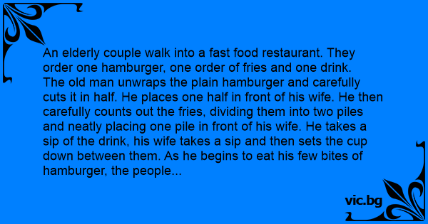 The old man unwraps the plain hamburger and carefully cuts it in half. He places one half in front of his wife. He then carefully counts out the fries, dividing them into two piles and neatly placing one pile in front of his wife. He takes a sip of the drink, his wife takes a sip and then sets the cup down between them. As he begins to eat his few bites of hamburger, the people around them keep looking over and whispering "That poor old couple - all they can afford is one meal for the two of them."