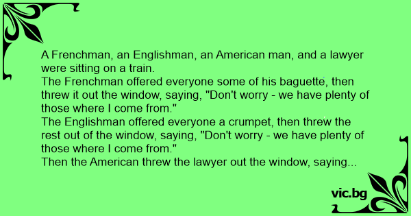 A Frenchman, an Englishman, an American man, and a lawyer were sitting on a train.