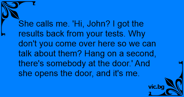 She calls me. 'Hi, John? I got the results back from your tests. Why don't you come over here so we can talk about them? Hang on a second, there's somebody at the door.' And she opens the door, and it's me.