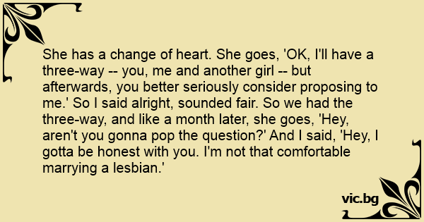 She has a change of heart. She goes, 'OK, I'll have a three-way -- you, me and another girl -- but afterwards, you better seriously consider proposing to me.' So I said alright, sounded fair. So we had the three-way, and like a month later, she goes, 'Hey, aren't you gonna pop the question?' And I said, 'Hey, I gotta be honest with you. I'm not that comfortable marrying a lеsвiаn.'