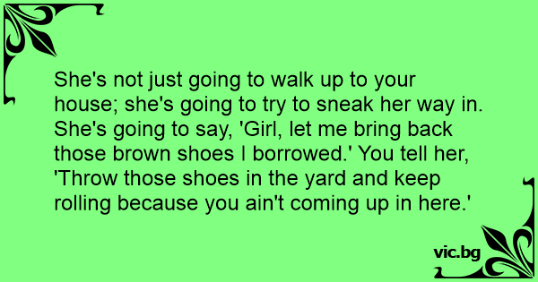She's not just going to walk up to your house; she's going to try to sneak her way in. She's going to say, 'Girl, let me bring back those brown shoes I borrowed.' You tell her, 'Throw those shoes in the yard and keep rolling because you ain't coming up in here.'
